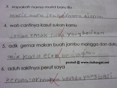 Nama pun budak sekolah, ada yang buat karangan main belasah jer. Kurang membaca antara faktor budak sekolah lemah dalam penulisan. Budak-budak sekarang lagi banyak faktor luarannya seperti bahasa slanga sms, bahasa internet, bahasa kartun doraemon dan lain-lain lagi.